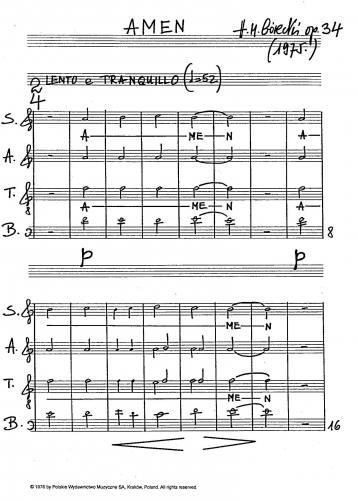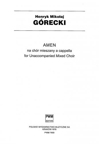 Amen is one of the first three works for unaccompanied choir written by Górecki between 1972 and 1975. The piece is a tribute paid by the composer to the tradition of Polish church hymns which are extremely dear to him. The character of concentrated meditation, typical of this composition, has been accentuated, on the one hand, by the limitation of the textual layer of the work to one title word amen, which is ''dressed'' by the composer in different harmonic-tonal ''attires'', culminating in A major, and, on the other hand, by sustained, slowly progressing values like steady, quiet breathing.