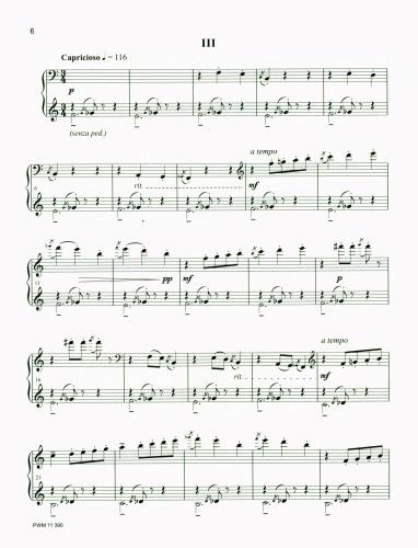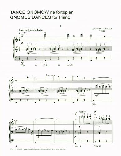 Gnomes Dances are four works that can be performed as a cycle or separately. Proper use of the pedal and precision of articulation and dynamics are very important. The Gnomes of the title are small creatures that in dancing show us their rich nature: funny, though shy in the first dance; mysterious and fearful in the second dance; sad, eager for reverie in the third and confident, decisive in the final dance.