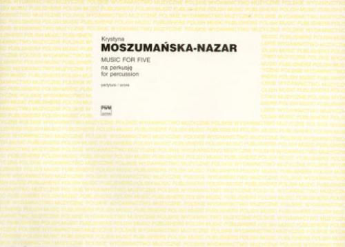 ''Music for Five is a composition for a great and extremly differentiated percussion instrumentarium composed of 5 groups of instrumets. As the authoress says: ''it is a masterly piece of music which gives the performers great possibilities of instrumental and interpretative parade. The work consised of two movements and each of them plays a different role on construction of the composition. the first movement - reflexive, quiet, with a nearly ''classical'' harmony and lyricism - is dominated by melodic instruments (marimba, vibraphone, bells, kettle-drums) sometimes with unconventional articulation media. It is a prelude to the second movement which is much more developed and where the proportions are different. . Instruments of undefined pitch dominate here. Moszumańska-Nazar uses them in a very interesting, nearly melodic way. This movement starts with almost whispering structures and though several climaxes leads to a long quasi0canon.The enormous energy is discharged in the improvisation af all the five musicians at the end of composition. parts for improvisation, which are so natural for percussion instrumentarium, appear in all Moszumańska-Nazar's compositions. Music for five was composed for Cracow percussion Group and the Group performed it for the first time during the Musica Viva festival organized by the Bayerischer Rundfunk in Munich on 24 February 1989.
