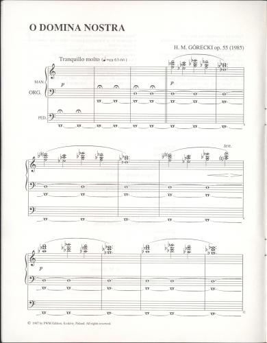 O Domina nostra is another composition representing the trend of sacred music in Górecki's output. The work was composed with the 600th anniversary of the Black Madonna image in mind. The connotations with chant are very clear here both in the tonal and textual layers, the latter being a Latin text compiled by the composer. The fact that the work was dedicated to Stefania Woytowicz, is extremely important, as that distinguished soprano together with her husband was a real tower of strength for Górecki during the serious disease caused by his damaged hip (1982). Thus the composition has a personal implication.