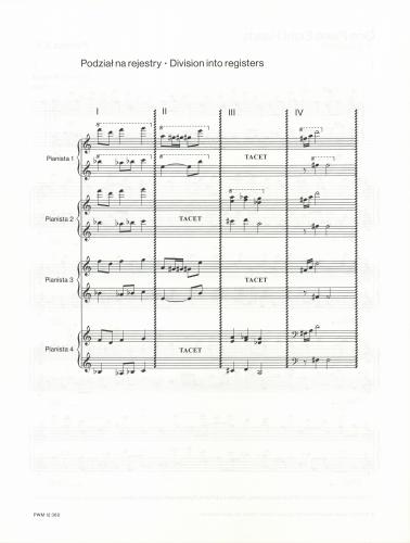 The parts should be performed independently, unsynchronised. The delay (desynchronisation) between the parts should not exceed a minim. Each section is followed by a ten-second rest, during which the performers remain perfectly still. During the rests, the piano's pedal remains depressed.