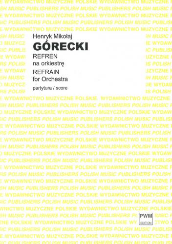 Refrain is a completely exceptional work by Górecki, in which two contrasting techniques are combined: hocket the medieval technique of polyphonic music and dodecaphony the twelve-note twentieth-century technique. Refrain consists of three movements: slow-fast-slow. The essence of the whole composition is formed by mirror models and phrases, which as the very title indicates may be defined as ''refrains''. It is also characteristic that particular refrains are developed in the way similar to variations, adopting new melodic-rhythmic shapes each time. The whole composition is also marked by the motive c - d sharp - c and the harmonic idiom progressing in whole tones. Textural and dynamic contrasts, melodic lines enclosed within the ambitus of the minor third, slowly progressing harmonic schemes all these elements constitute an integrated and extremely original work. Refrain is one of those works, in which Górecki allowed himself to give vent to his passion, i.e. contemplation of the universe. According to the composer himself, it is a reflection of an imagined ''experience of flying at high altitude between the sea and the stratosphere''. It is also the first composition written by Górecki in response to a foreign commission and premiered abroad.