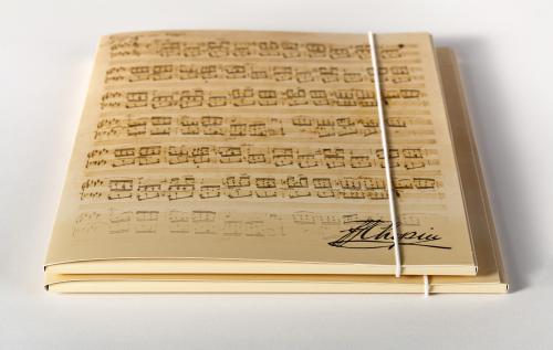 Elegant cardboard folder coated with luminous foil, N size, with Fryderyk Chopin's autograph nad notes. The folder, 5 mm thick, has three wings and a business card cut, closed with an elastic band.