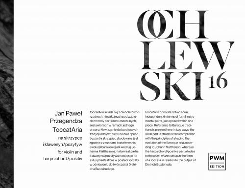 ToccatAria consists of two equal, independent (in terms of form) instrumental parts, juxtaposed within one piece. Reference to Baroque traditions is present here in two ways: the violin part is structured in compliance with the principles of shaping the evolution of the Baroque aria according to Johann Mattheson, whereas the harpsichord/positive part alludes to the stilus phantasticus in the form of a toccata in relation to the output of Dietrich Buxtehude.