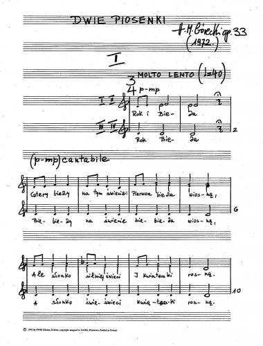 Two Ditties are short pieces entitled The Year and Poverty and Birds' Gossip. Both are based on Polish national dances, the first one mazur, the second krakowiak.