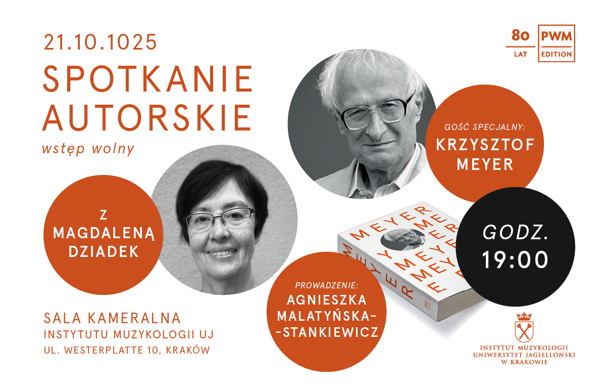 Polskie Wydawnictwo Muzyczne oraz Instytut Muzykologii Uniwersytetu Jagiellońskiego zapraszają na spotkanie autorskie z Magdaleną Dziadek. Gościem specjalnym wieczoru będzie Krzysztof Meyer – kompozytor i bohater książki Krzysztof Meyer. Nowoczesny i romantyczny. Publikacja ta stanie się punktem wyjścia do rozmowy, którą poprowadzi Agnieszka Malatyńska-Stankiewicz. To wszystko już 21 października o godz. 19:00 (godzina zmieniona!) w Sali Kameralnej Instytutu Muzykologii UJ (ul. Westerplatte 10, Kraków).