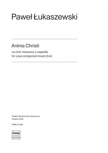 W dorobku kompozytorskim Pawła Łukaszewskiego wiele dzieł postrzegać można jako rodzaj dokumentacji zdarzeń z życia kulturalnego. Egzemplifikację stanowi m.in. utwór Anima Christi (2018) przeznaczony na chór mieszany a cappella, którego okoliczności powstania wyjaśnia dedykacja wpisana w partyturę: „Janowi Łukaszewskiemu i Polskiemu Chórowi Kameralnemu na 40-lecie działalności”. Muzyczny prezent od kompozytora jest z pewnością wyrazem uznania dla jednego z najlepszych zespołów chóralnych w Polsce, ale i gestem wdzięczności, podziękowania za wieloletnią owocną współpracę związaną z wykonawstwem dzieł twórcy. Nie dziwi zatem fakt, że Anima Christi prawykonał i zarejestrował na płycie Dux (Polska Muzyka Chóralna, 2018) właśnie ów zespół.