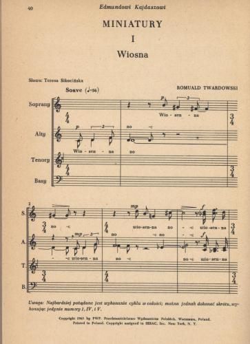 Partytura studyjna nie upoważnia do kopiowania i sporządzania głosów wykonawczych. W celu legalnego nabycia większej ilości partytur chóralnych, po preferencyjnych cenach dla zespołu, prosimy wysłać e-mail pod adres: handel@pwm.com.pl