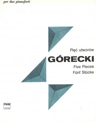 Pięć utworów na dwa fortepiany jest wyrazem zwrócenia się kompozytora w kierunku niemieckich, francuskich i włoskich tradycji serialnych. Szczególną uwagę Góreckiego przykuła radykalna postać 12-dźwiekowej serii ujętej w fakturę punktualistyczną. Seria w jego Pięciu utworach dotyka poza wysokościami dźwięków (najbardziej rygorystycznie przestrzegana) również innych parametrów dzieła: dynamiki, rytmiki i rejestrów. Każdy z pięciu utworów posiada tylko sobie właściwą cechę, np.: I spełnia funkcję ekspozycji dla pozostałych kompozycji, zawiera pełną 12-tonową serię, II posiada krótkie struktury lustrzane (palindromy wysokości dźwiękowych), IV odznacza się klasterami o ustalonej skali, V z kolei najbardziej rozbudowany (2 części) dysponuje różnymi rodzajami serii i podserii. [Na podstawie: A. Thomas, Górecki, Kraków 1998, PWM.]