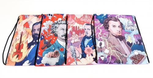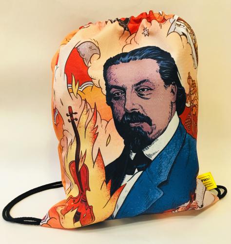 Kolorowy plecak / worek wykonany z wyjątkowo grubego, wytrzymałego i wodoodpornego poliestru, ozdobiony grafiką z popiersiem Henryka Wieniawskiego autorstwa Mateusza Kołka. Bardzo praktyczny i efektowny.