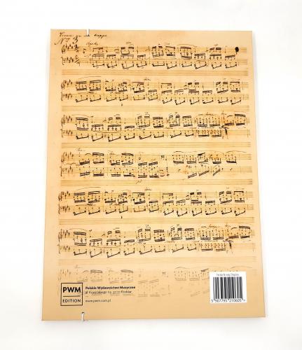 Elegancka kartonowa teczka w kolorze beżowym, z motywem nutowym oraz autografem Fryderyka Chopina. Teczka o grubości 5 mm posiada trzy skrzydła oraz nacięcie na wizytówkę, zamykana na gumkę. Pomieści zarówno format A4 jak i N.