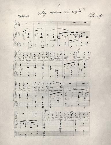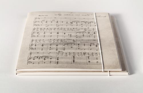 Elegancka kartonowa teczka powlekana świecącą folią, w rozmiarze N z motywem nut i autografem Ignacego Paderewskiego. Teczka o grubości 5 mm posiada trzy skrzydła oraz nacięcie na wizytówkę, zamykana na gumkę.