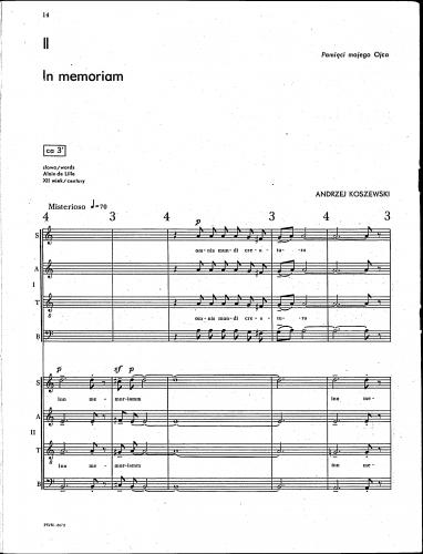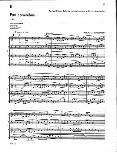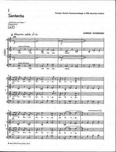 Zbiór zawiera trzy utwory polichóralne na chóry mieszane. Jeden z utworów (Sententia) dedykował Koszewski pamięci K. Szymanowskiego w setną rocznicę jego śmierci.