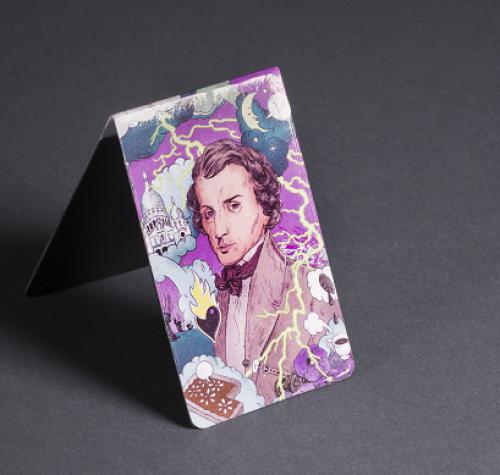 Zakładka magnetyczna ozdobiona oryginalną grafiką autorstwa Mateusza Kołka, praktyczny gadżet nie tylko dla miłośników Chopina. Wymiary po rozłożeniu 13x4 cm, karton 250g z laminatem + folia magnetyczna 0,4mm.